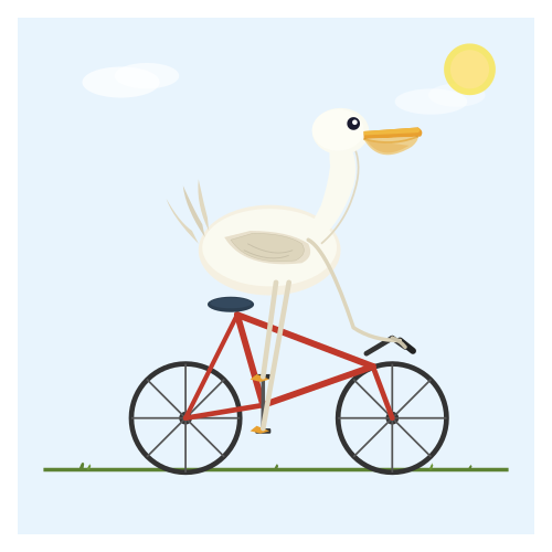 Pelican-on-a-bicycle SVG benchmark generated by glm-5.1 (default reasoning). Features a cream-white pelican riding a red-framed bicycle with spoked wheels, orange beak with throat pouch, wing gripping handlebars, and a scenic sky background with clouds and sun.